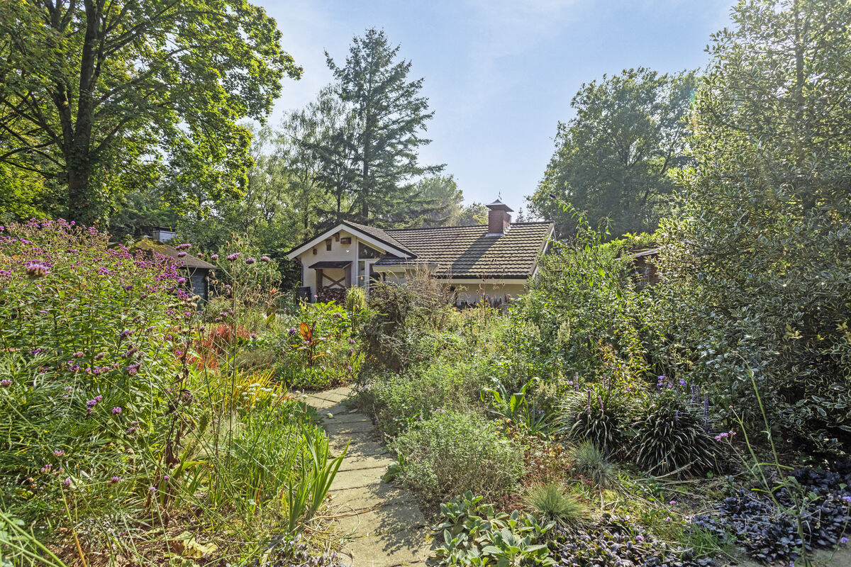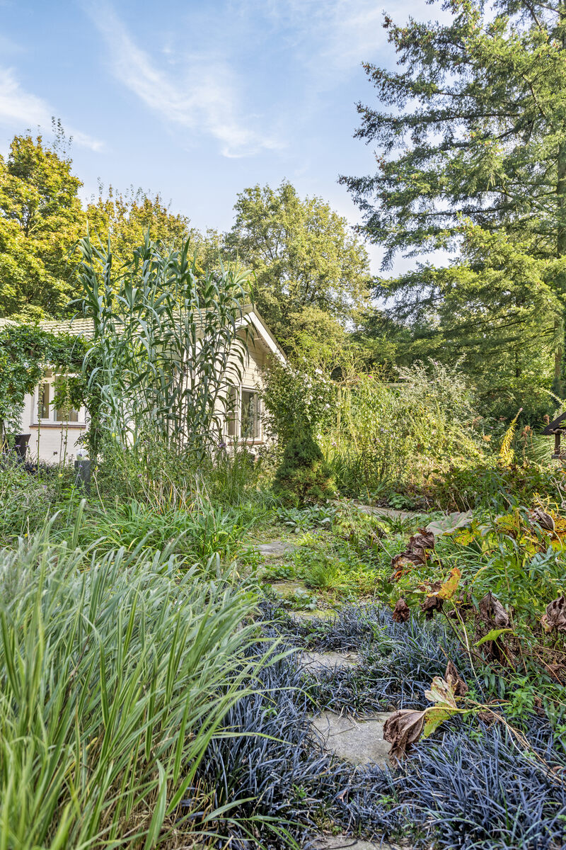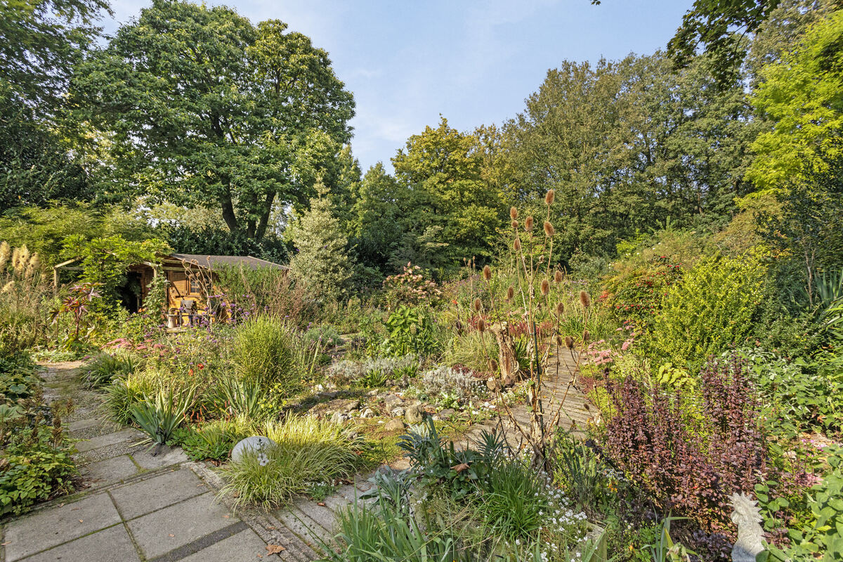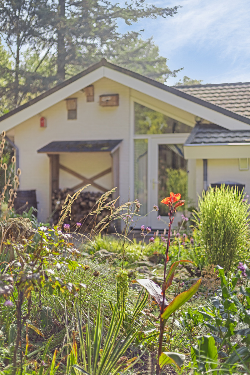Vrije tuin met fijne zitplekken. In deze tuin tref je bijzondere bloeiende planten aan.