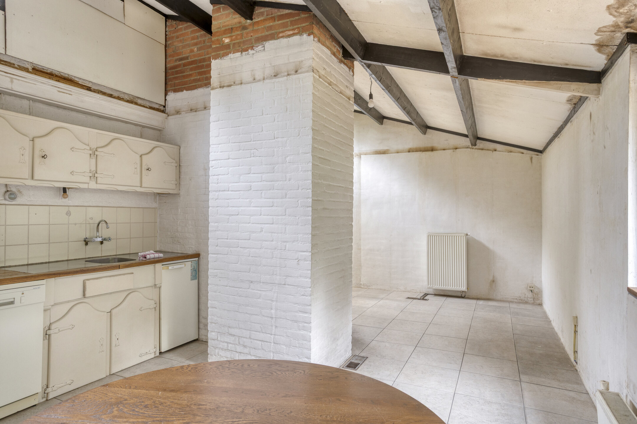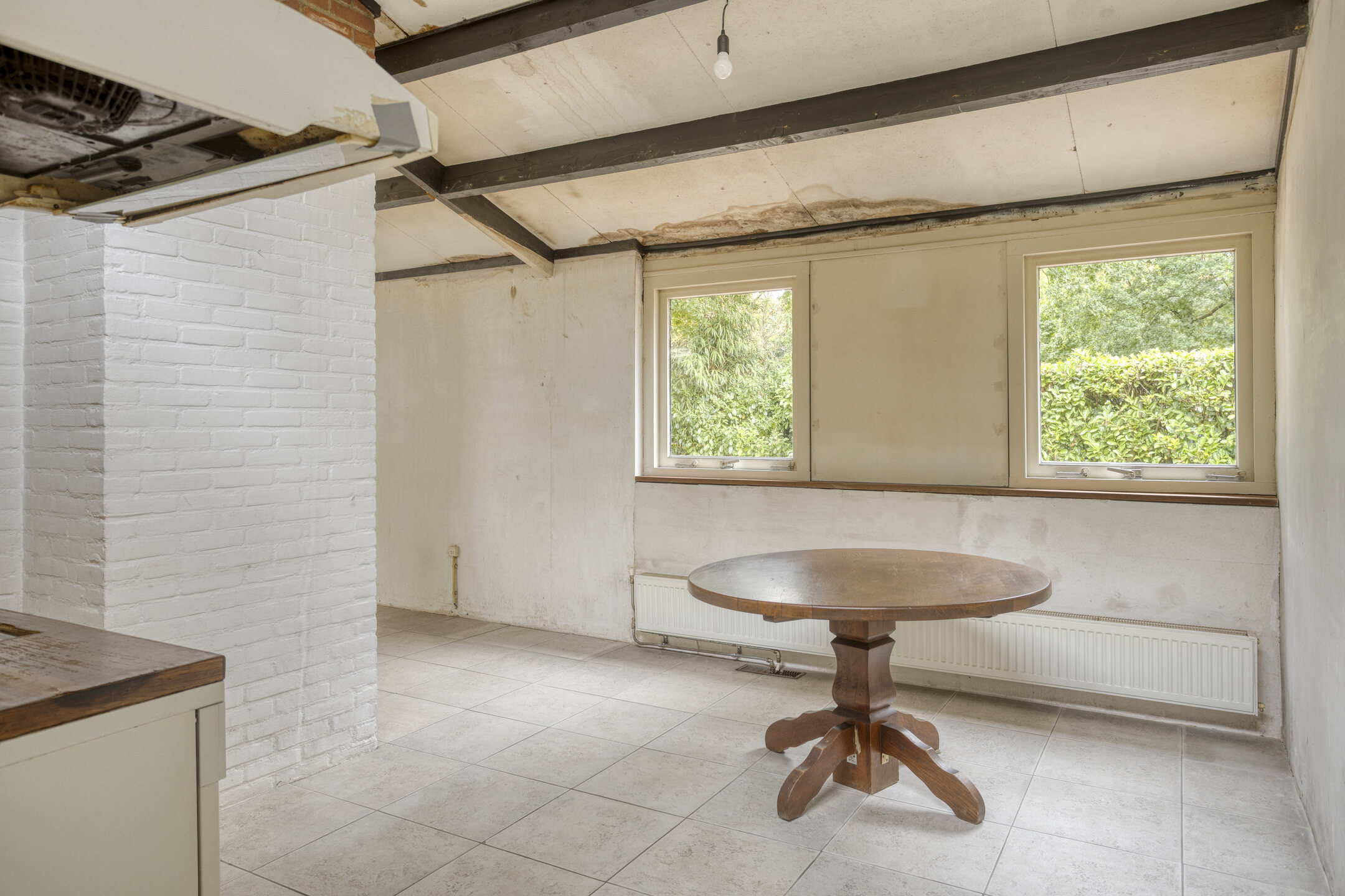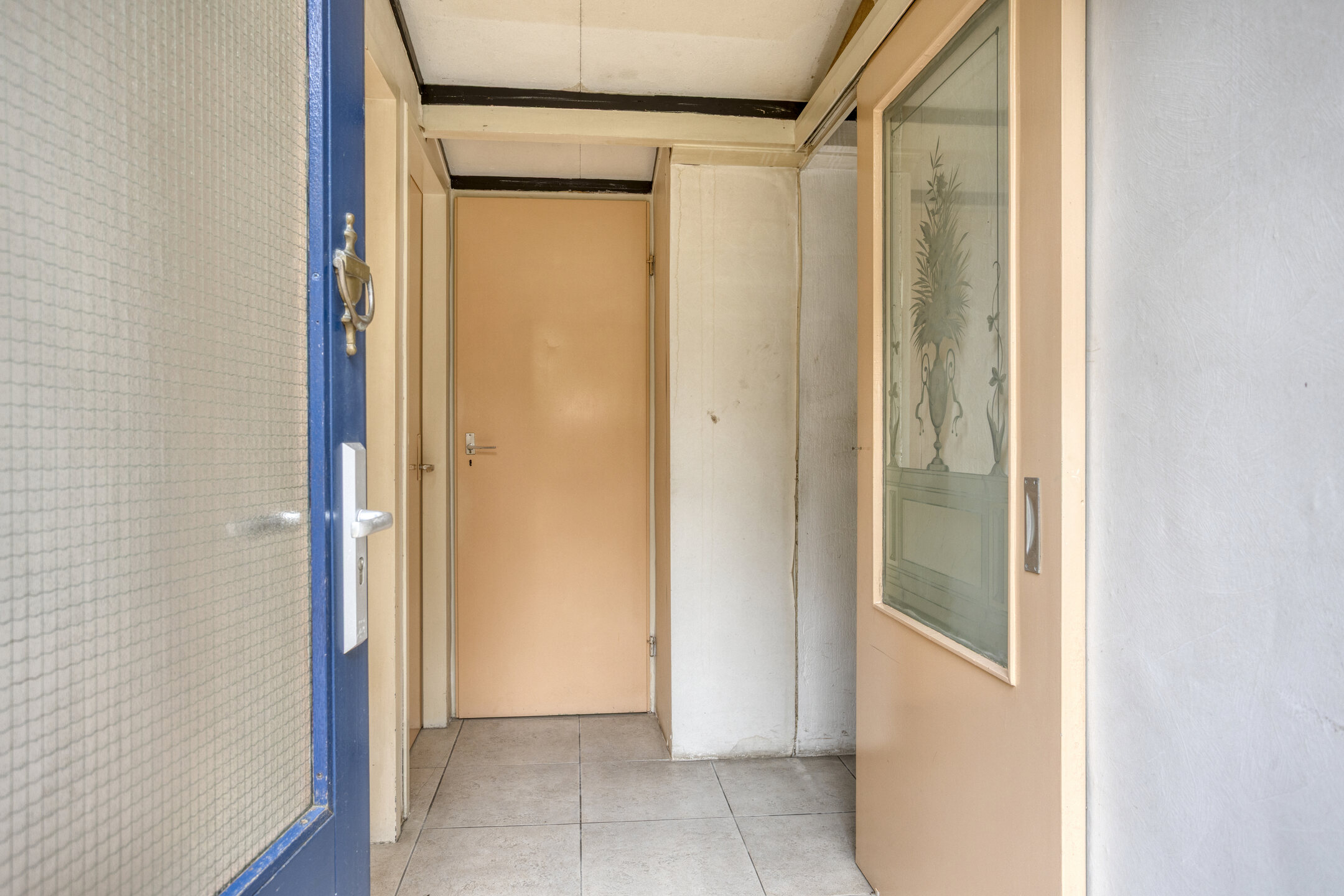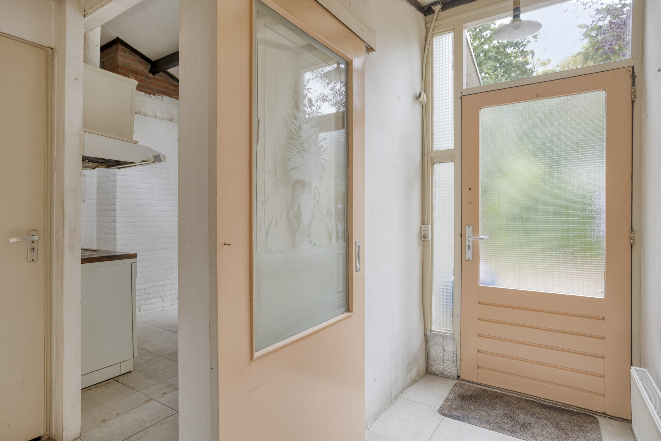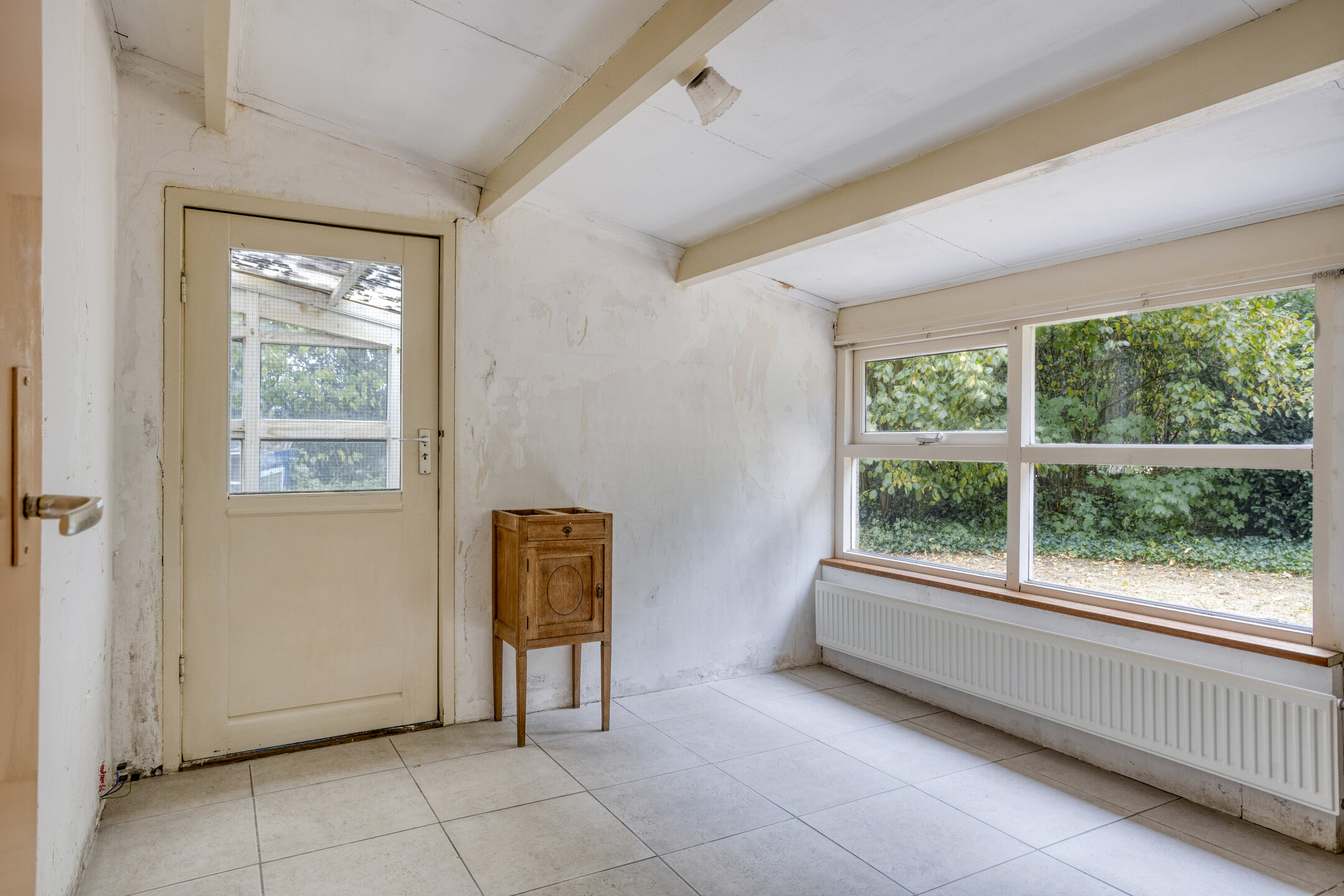 Entree; hal met schuifdeur naar de eet-/woonkeuken met eenvoudig keukenblok. Doorloop naar de zitkamer met rookkanaal en openslaande deuren naar het terras van de achtertuin. De hoge plafonds in de keuken en de zitkamer versterken de ruimtelijke opzet en door de aldaar geplaatste bovenramen komt er veel extra daglicht binnen.