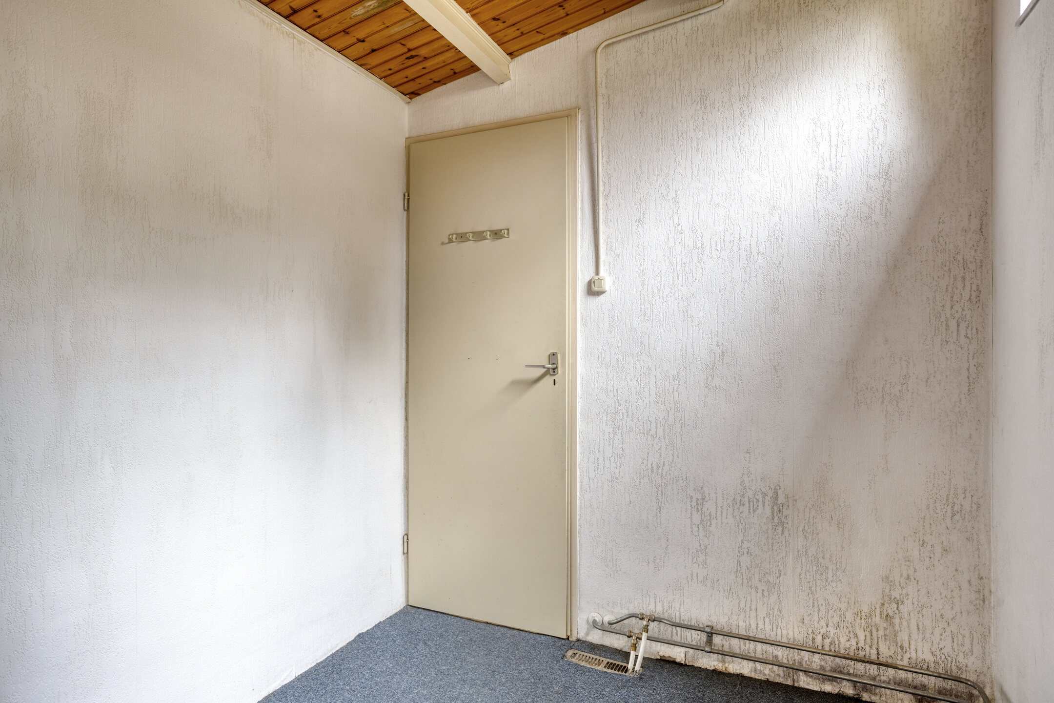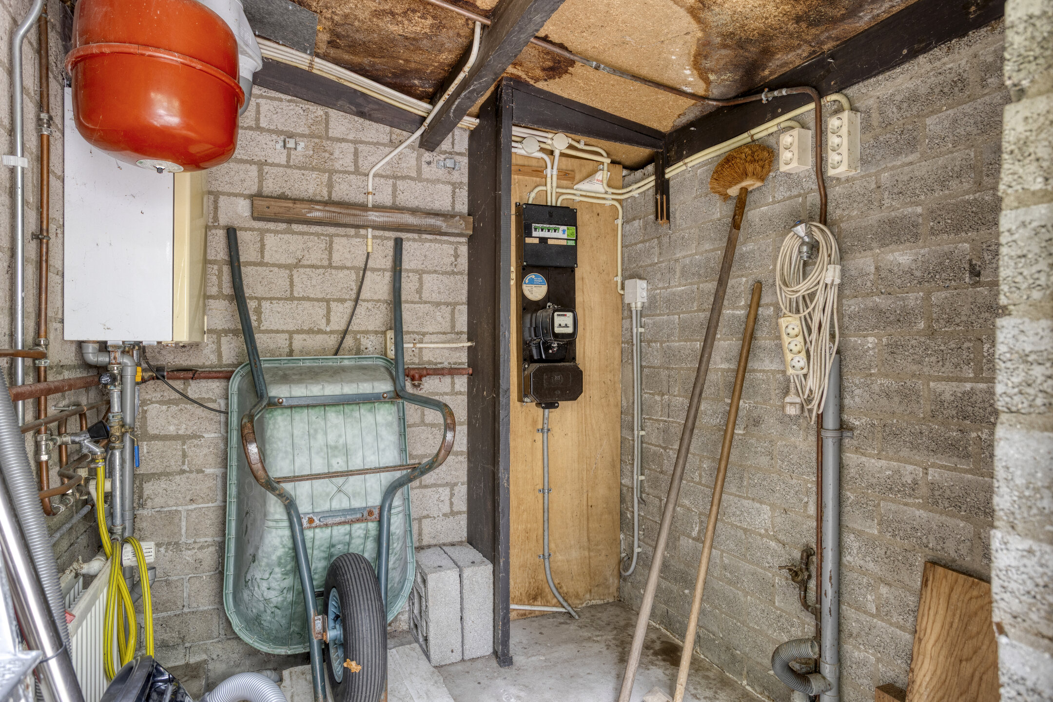 Aan de achterzijde van deze woning is een aanpandige bergruimte gesitueerd. Hier hangt de cv-ketel, is de groepenkast met automaten en aardlekschakelaar. En er is een aansluiting witgoed.