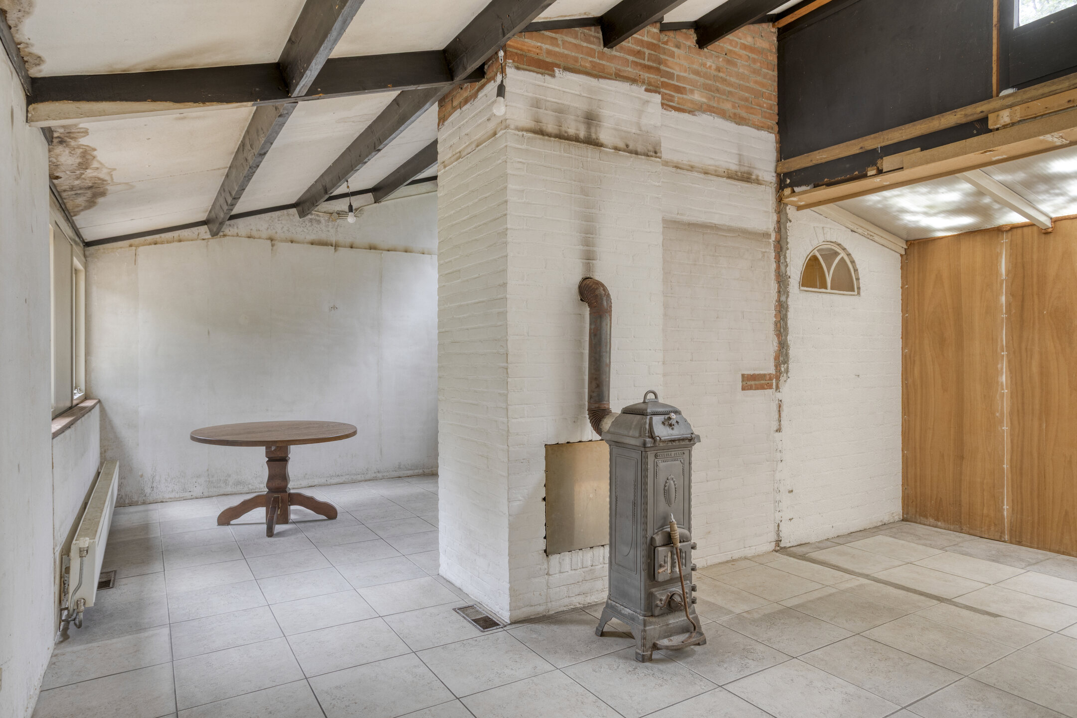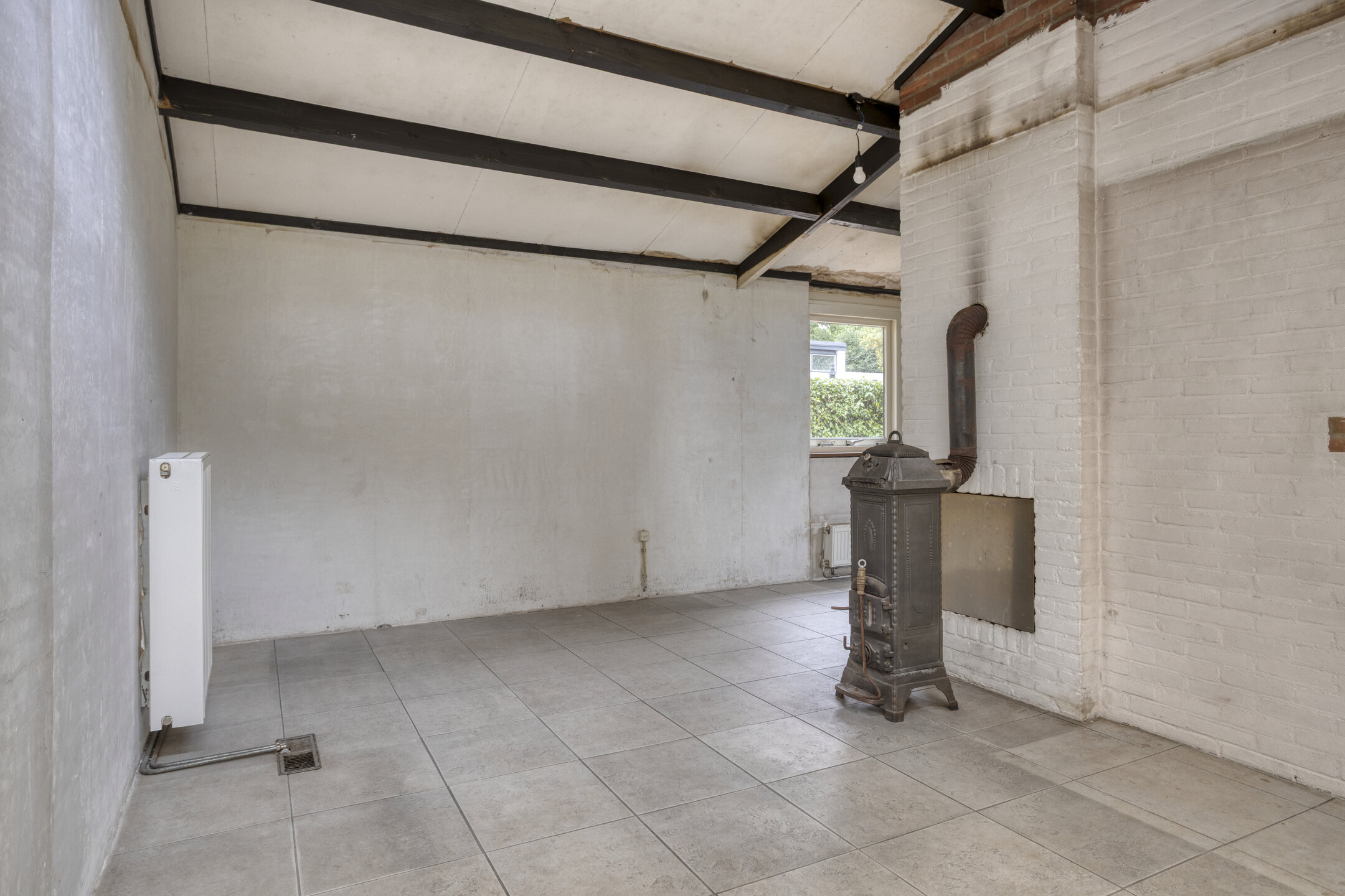 Remeha HR combiketel uit 2005 en houtkachelaansluiting in de woonkamer.