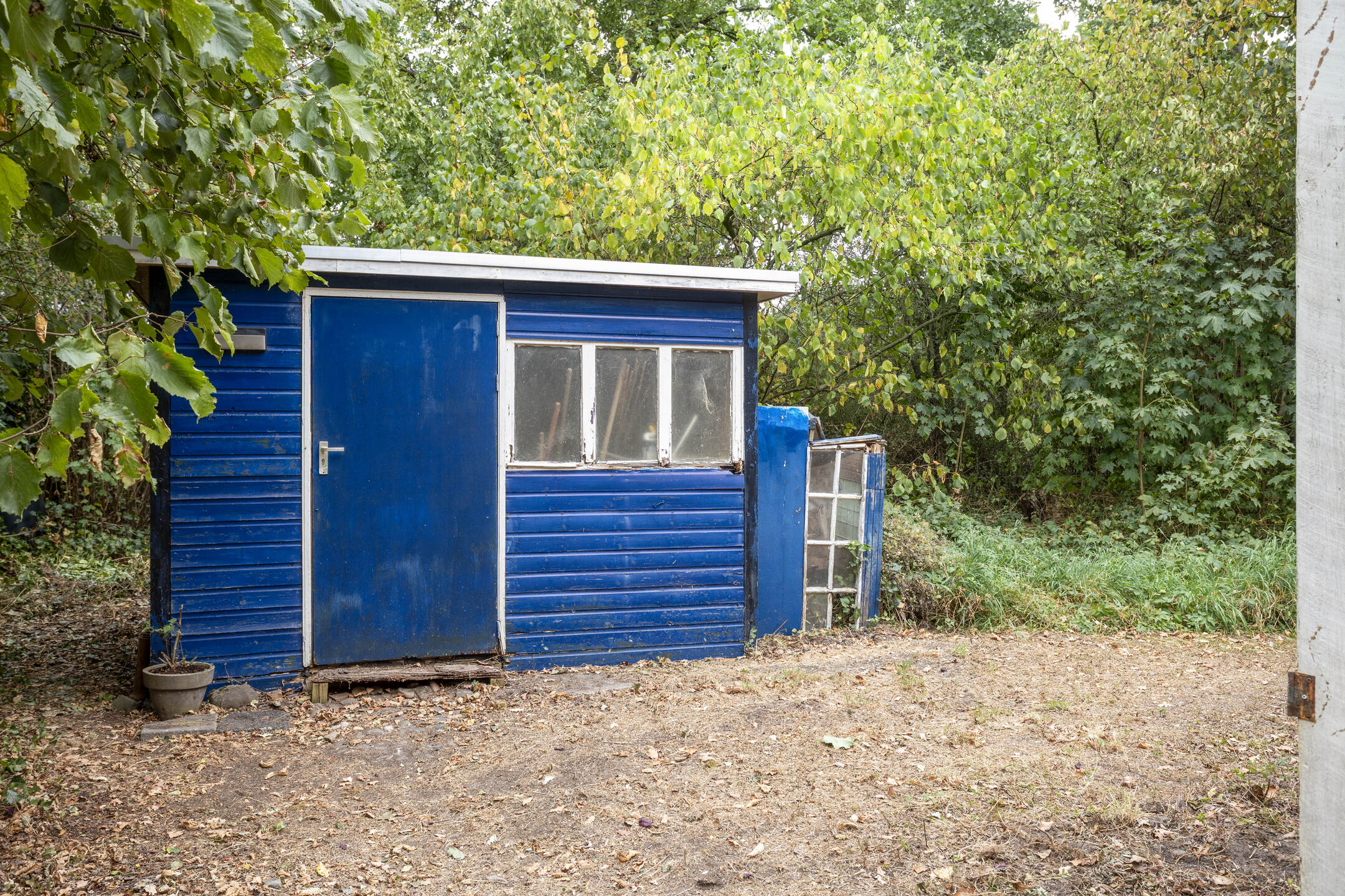 Er is een separate vrijstaande houten tuinberging.